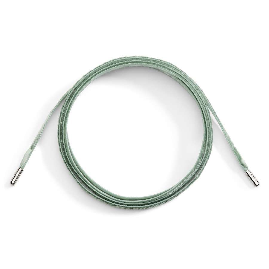 Il classico cordino in cotone si trasforma in un raffinato velluto, completato da eleganti terminali in argento applicati a mano: un pezzo unico, realizzato in un’unica tiratura.
